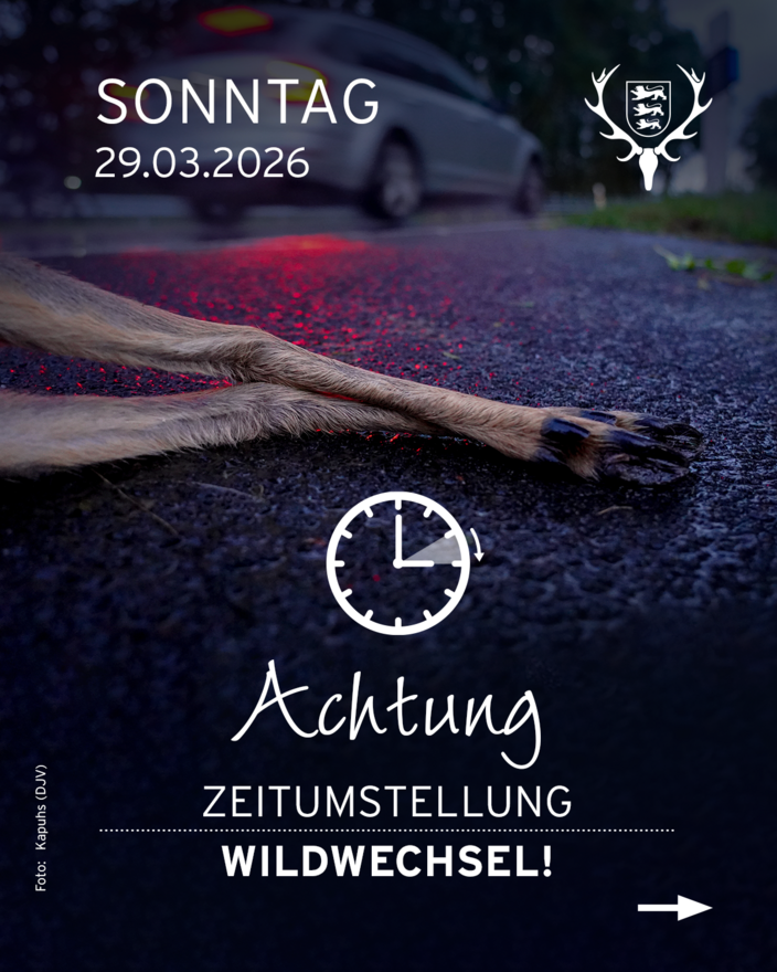 (Stuttgart, 25.03.2026) In der Nacht auf Sonntag, 29. März, werden die Uhren von 2 Uhr auf 3 Uhr vorgestellt. Für die Menschen springt nur der Zeiger eine Stunde nach vorn – doch die Wildtiere sind schlecht informiert. Reh, Wildschwein und Co. orientieren sich nicht an der Uhr, sondern am Tageslicht.