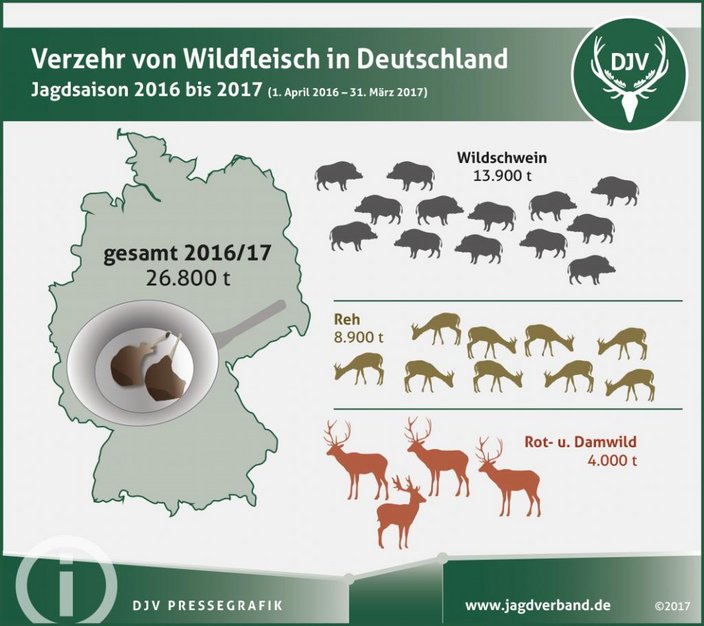 Saftiger Wildschweinschinken oder zarte Rehkeule stehen nicht nur zu Weihnachten hoch im Kurs. Nach einer aktuellen Hochrechnung des Deutschen Jagdverbandes (DJV) wurden in der vergangenen Jagdsaison (1. April 2016 bis 31. März 2017) 26.800 Tonnen heimisches Wildbret zubereitet und gegessen. Das Fleisch vom Wildschwein mit 13.900 Tonnen ist nach wie vor am begehrtesten. Auch Reh erfreut sich mit 8.900 Tonnen großer Beliebtheit. Vom Rotwild wurden 2.700 Tonnen verzehrt, gefolgt vom Damwild mit 1300 Tonnen.