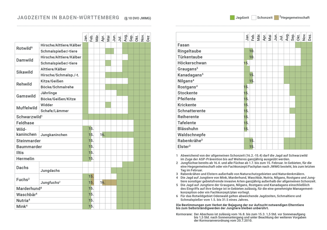 Danach kann Schwarzwild ganzjährig überall im Wald und im Offenland bejagt werden, wo das möglich ist. Zu beachten ist der Muttertierschutz. Einschränkungen: Verboten ist die Bewegungsjagd bei Nacht oder, wenn Wildtiere durch besondere Umstände großflächig einer stark erhöhten Verletzungsgefahr ausgesetzt sind oder die Bewegungsjagd, mit Ausnahme des Kreisens oder der Erntejagd im Offenland, zwischen 1. Februar und 30. September ausgeübt wird.